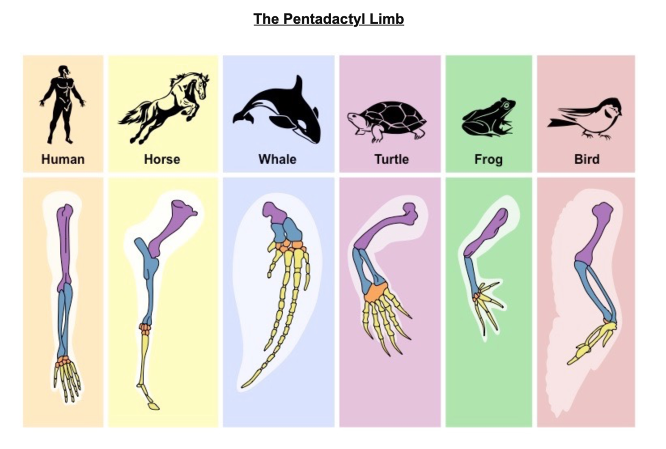 Example - pentadactyl limb (five digit limb) - human/bird/reptile - different locomotion