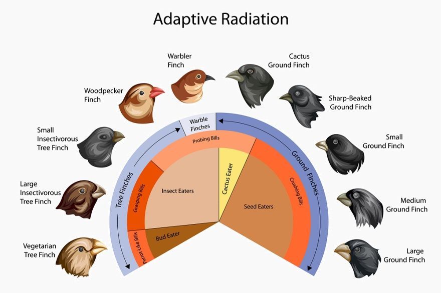 ADAPTIVE RADIATION - new species rapidly diversify from ancestor where each new species is adapted to utilise a specific unoccupied niche in the environment/resources