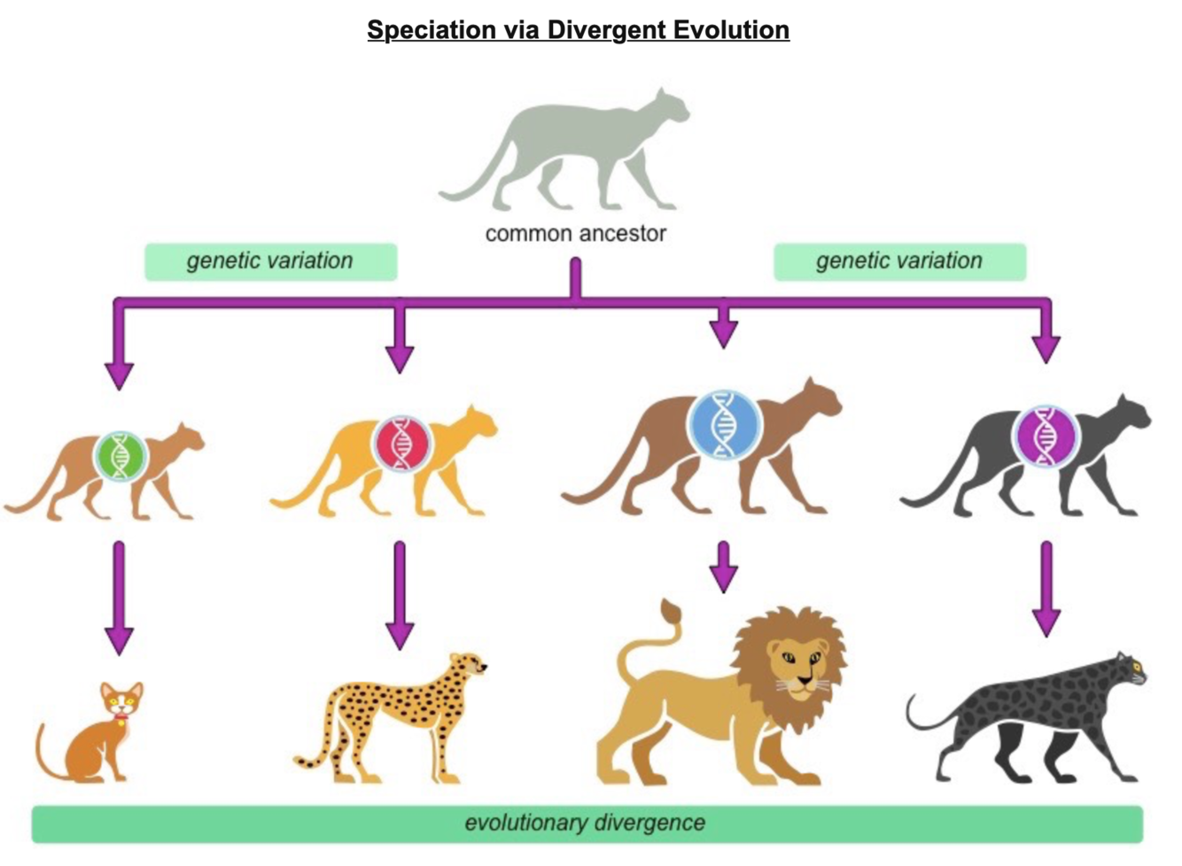Speciation happens in gradual divergence - two populations separated - genetic variation is random - natural selection will favour more adapted - the primary populations will gradually diverge
