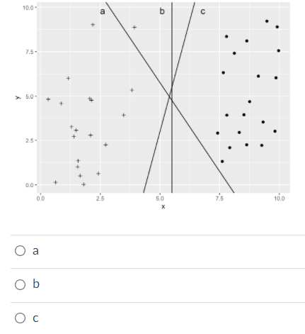 Hyperplane b maximises the margin between the two classes.