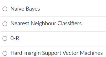 For 0-R the model is simply the label of the most frequent class (O(1)). The model in Naive Bayes is a set of prior probabilities and conditional probabilities (O(2+2*2)). In SVM model is the maximum-margin hyperplane, defined by w and b (O(2+1)).