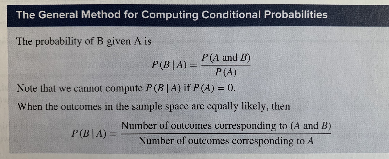 The conditional probability of an event B, given an event A, is denoted P(B |A). P(B|A) is the probability that B occurs, under the assumption that A occurs. We read P(B|A) as “the probability of B, given A.”