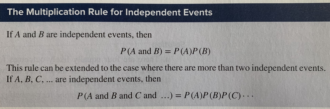 Two events are independent if the occurence of one does not affect the probability that the other event occurs.