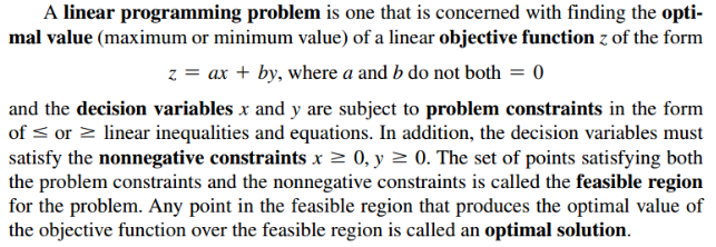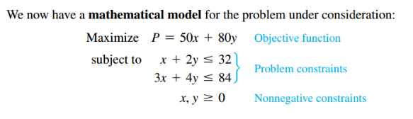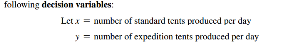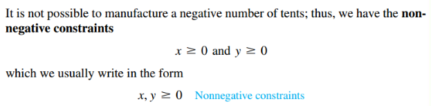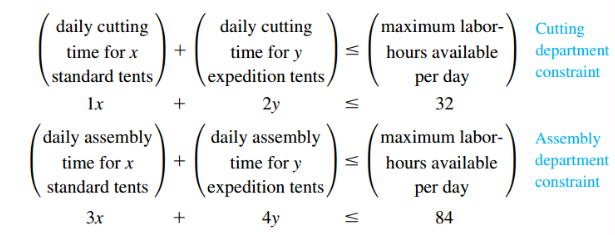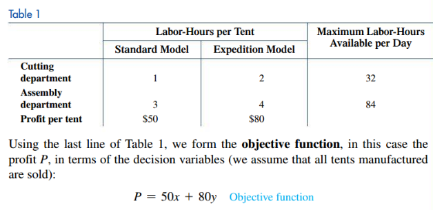 The form of the objective function indicates that the profit can be made as large as we like, simply by producing enough tents. But any manufacturing company has limits imposed by available resources, plant capacity, demand, and so on. These limits are referred to as problem constraints.
