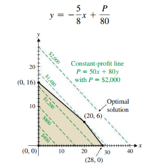 By assigning P in P=50x +80y a particular value and plotting the resulting