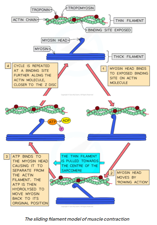 Myosin head moves again pulling actin filaments even closer to centre of sarcomere and causing sarcomere to shorten further