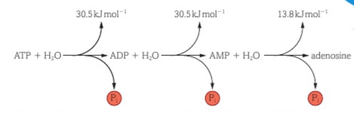 Describe the amount of energy released through each hydrolysis reaction of ATP