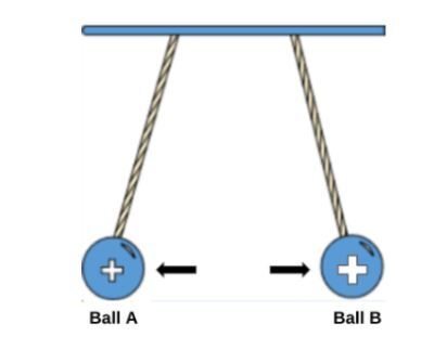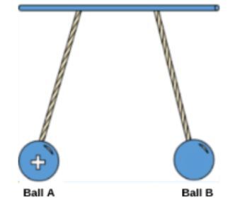 Two balls are hanging from a rod. Ball A is labeled as positively charged. Ball B is not labeled with a charge.