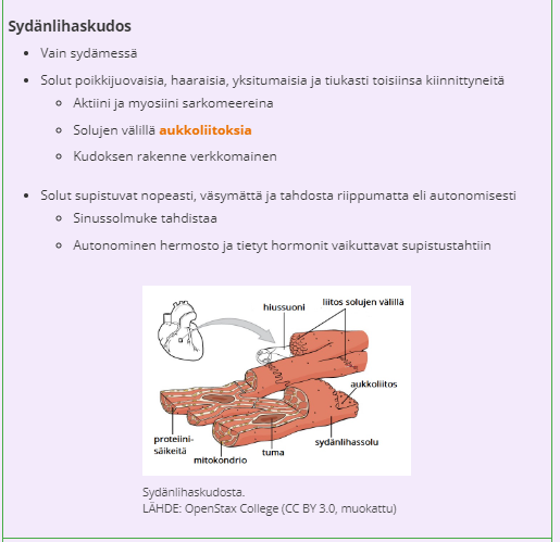 Tehtävät: Sydänlihas vastaa sydämen supistumisesta ja veren pumpusta kehon läpi. Se toimii tahdosta riippumattomasti ja jatkuvasti ylläpitäen verenkiertoa ja hapensaantia kaikille kehon soluille.