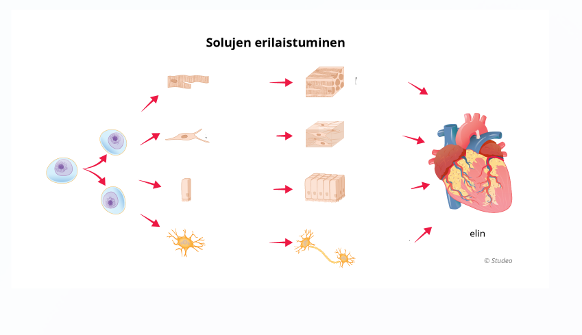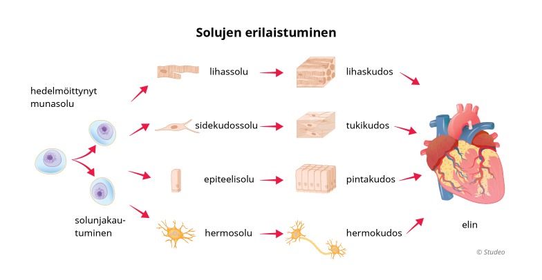 Solujen erilaistumisessa alkuperäiset, monipuoliset alkiosolut erikoistuvat erilaisiin tehtäviin ja muuttuvat eri kudosten ja elinten muodostaviksi soluiksi. Tämä erilaistuminen tapahtuu erilaistumisproteiinien ja geenien säätelyn avulla, jotka ohjaavat solujen toimintaa ja muuttavat niiden rakennetta ja toimintoja.