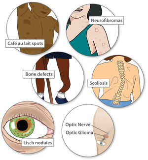 Presentation of Neurofibromatosis type 1 vs type 2