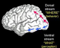 Where is the lesion in a pt who can’t see objects but can grasp them correctly (can’t tell you orientation, but can interact to put something in slot just fine)
