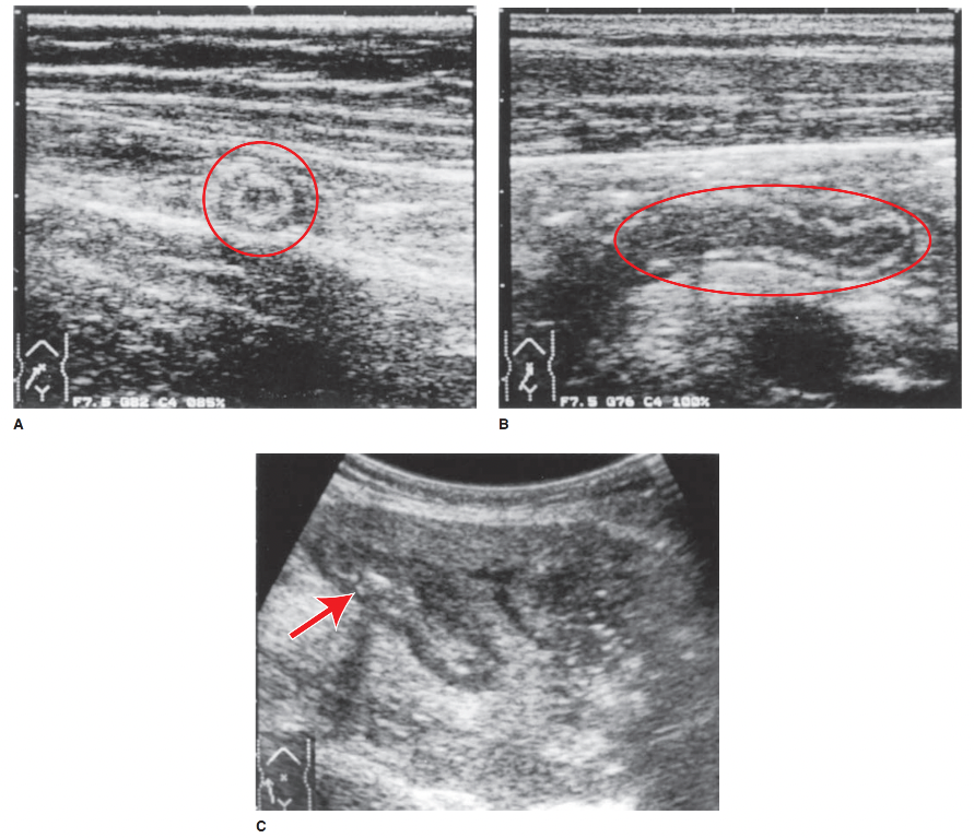 - typical findings in appendicitis are a thickened, noncompressible appendix >6 mm in diameter
