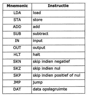 Wat zijn de mnemonics van de instructieset van de virtuele computer in het handboek?