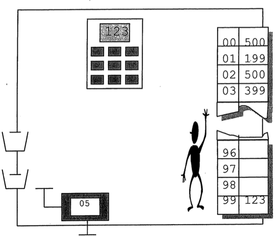 De bediende gaat naar de rekenmachine, schrijft de inhoud van de display op een blad papier en legt dat blad in het uit-bakje.