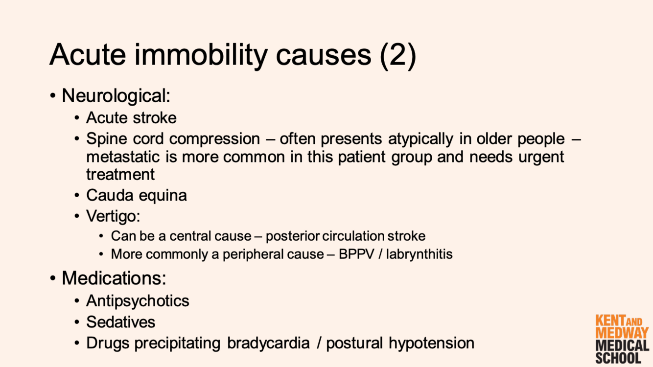 What neurological conditions can cause acute immobility in the older population?