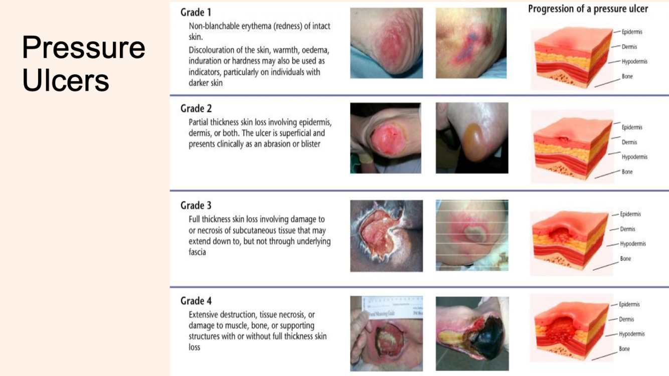 Grade 1 = redness, discolouration, warmth - skin not broken
