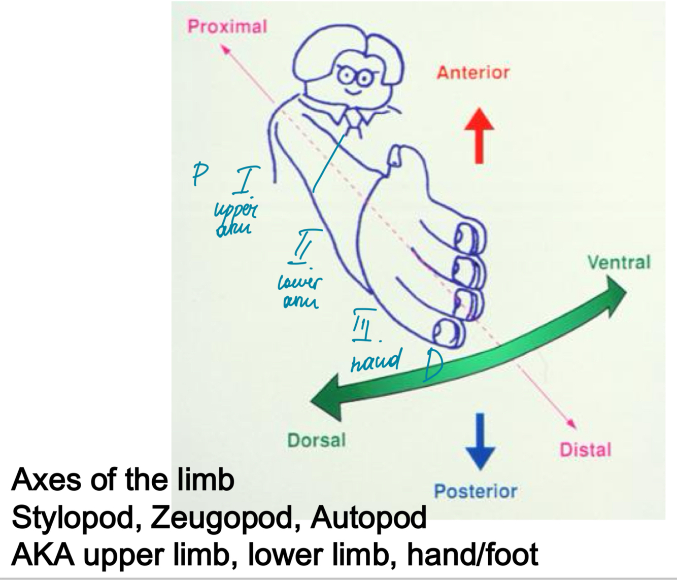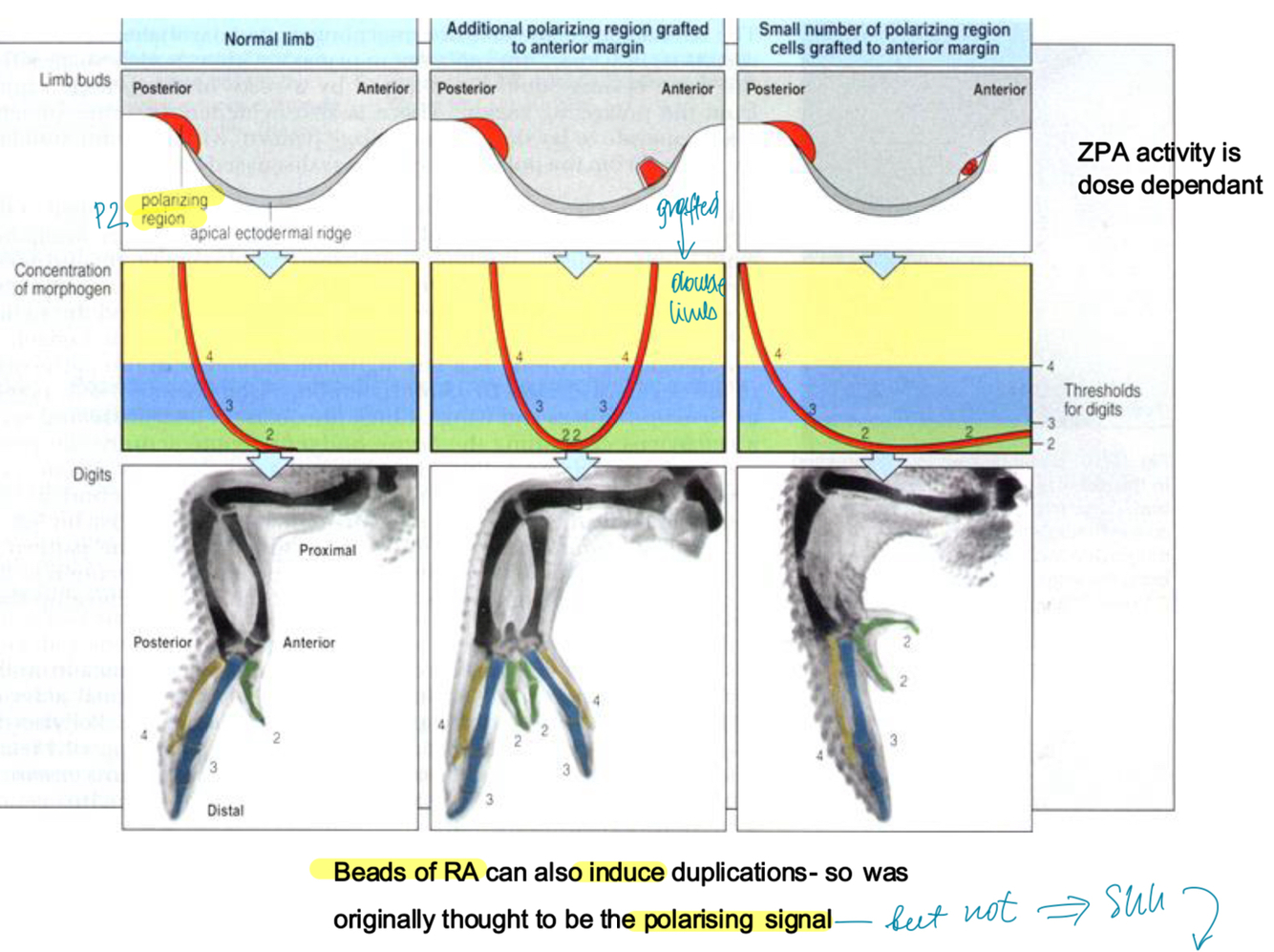 A-P axis of the limb patterned from the posterior - zone of polarising activity (ZPA) - signals - morphogen conc gradient - Shh