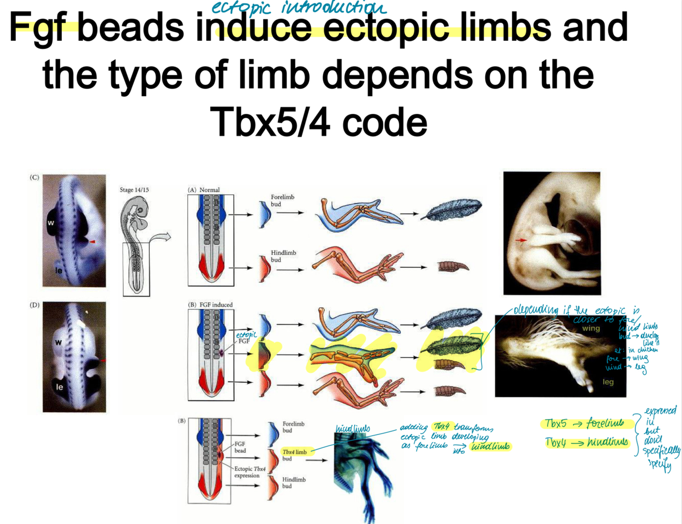 Ectopic Fgf beads induce limb formation - type of limb depends on Tbx4/5