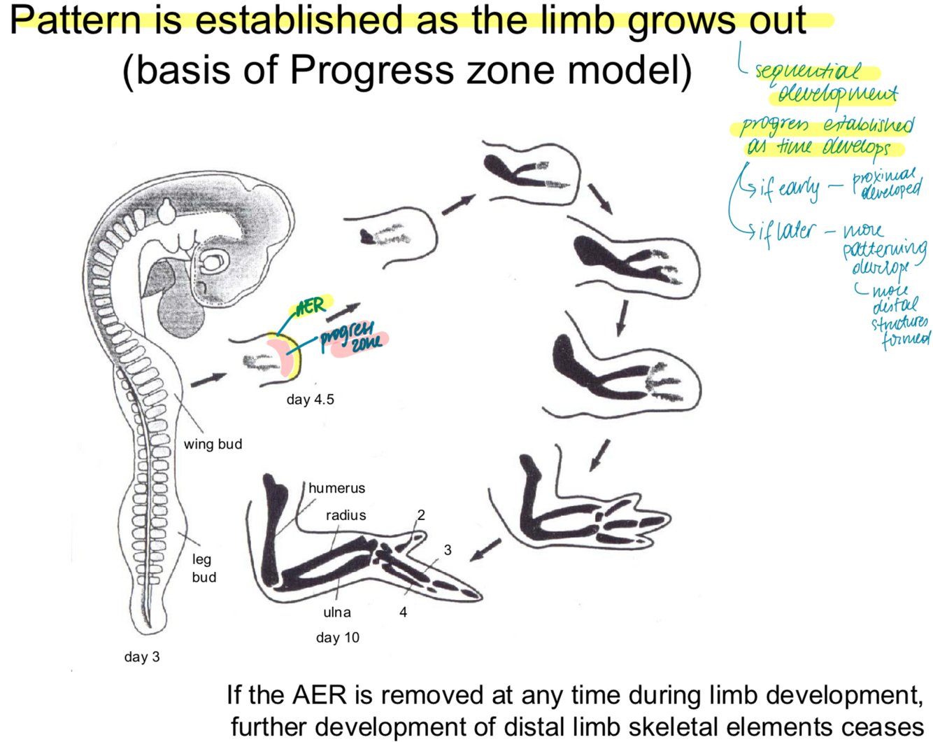 Limb outgrowth develops sequentially - progress established as time develops - the later AER removed - the more distal development established