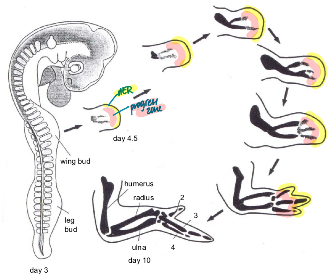 Apical ectodermal ridge (AER) - necessary for outgrowth of limb bud - AER responsible for P-D patterning - cells under AER = progress zone (PZ)