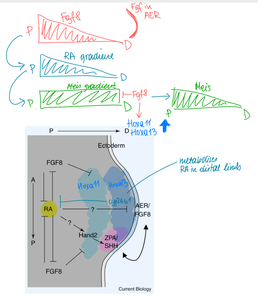 Fgf8 -> activates RA - RA diffuses P-D -> activates Meis/Meis2 proximal gene + Hoxa13, Hoxa11 distal genes