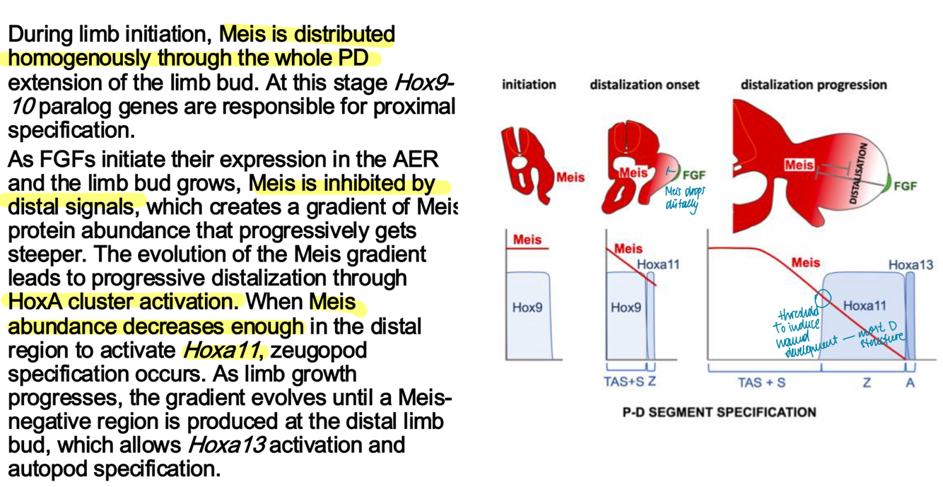 2. FGF expressed in AER -> inhibits Meis expression in distal => Meis gradient in P-D axis