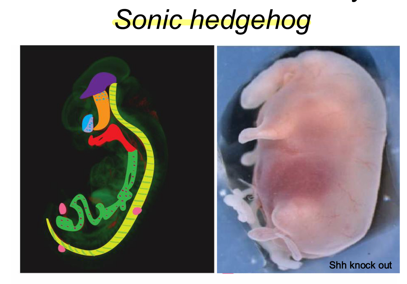 Shh is a major regulator of development - acts as a morphogen - acts many times in development for different functions - Shh-/- mutants very defected - no distal limb, no head, no normal eye development,
