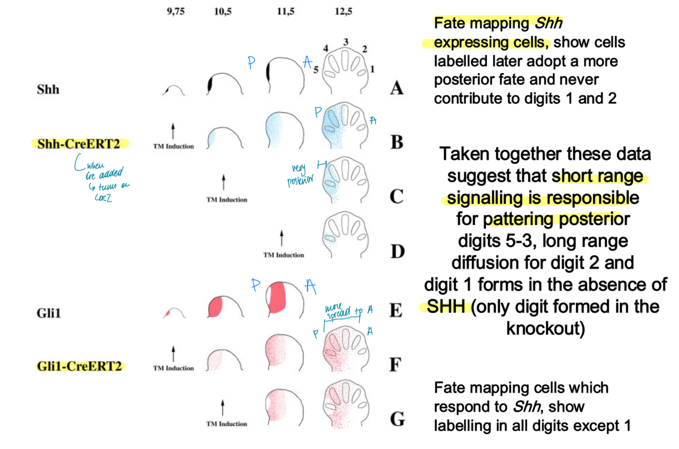 Shh was fate mapped - Shh expressing cells adopt more posterior fate - not contributing to digits 1 and 2