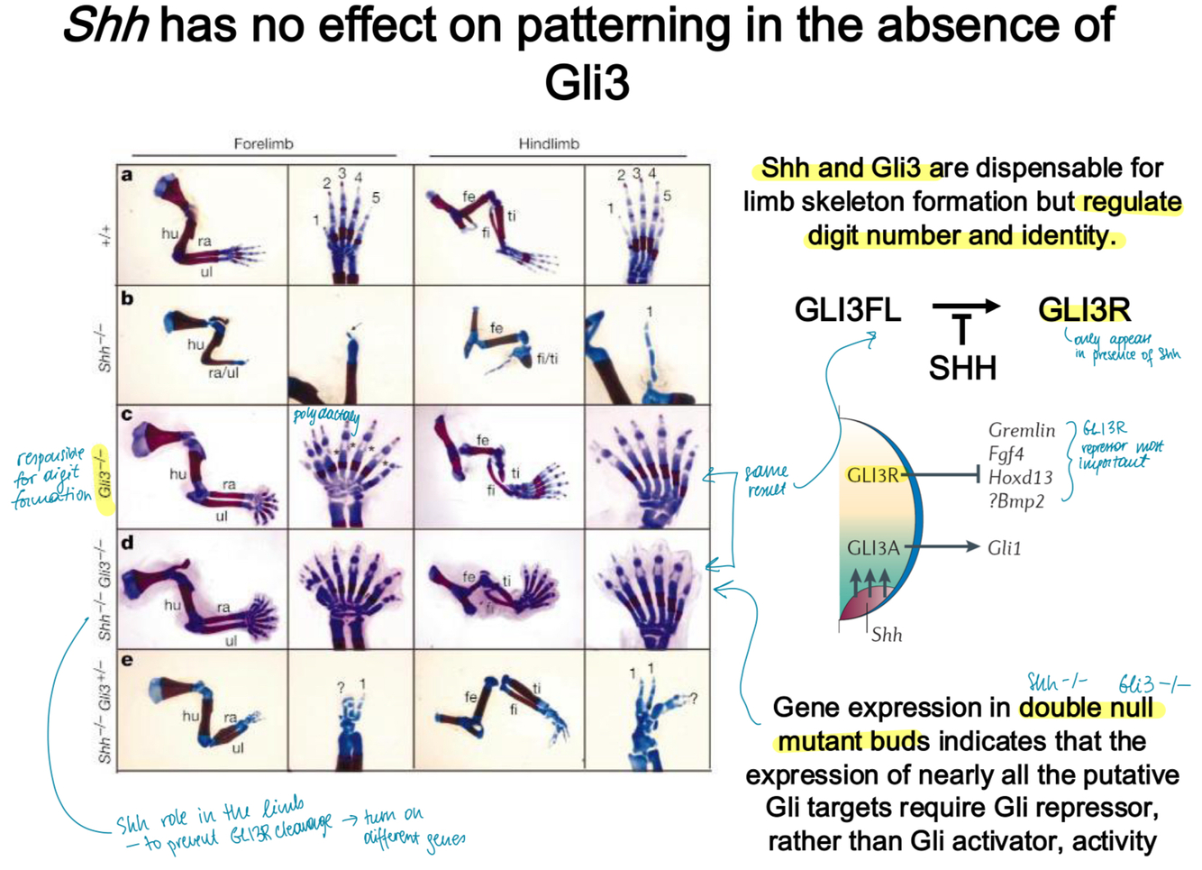 Gli3 downstream of Shh, mjust oth be ative for effect - if Shh-/- -> limbs can still develop some with only Gli3 - but if double KO Gli3-/-, Shh-/- -> same phenotype as Gli3-/-