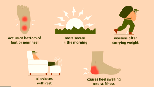 - Pain on the underside of the heel, usually 4cm forward from heel