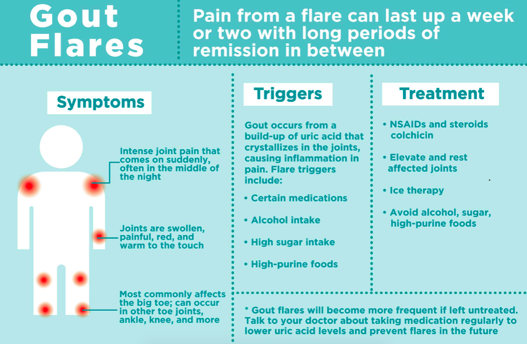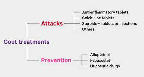 - Lifestyle advice: avoid alcohol and foods high in uric acid like meat, bacon, yeast, lots of fluids, weight loss, stop smoking, vit C supplements