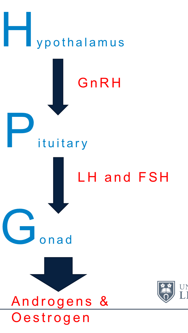 High levels of LH and FSH stimulate gonads (testes/ovaries) to release androgens and oestrogen - have negative feedback on GnRH