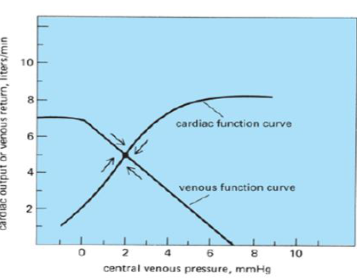Lo más importante es que ambas curvas se unen en un punto de equilibrio (PVC entre 0-2 mmHg), en donde el valor del gasto cardiaco y del retorno venoso se iguala (5 lts/min) → Esto representa un funcionamiento adecuado (fisiológico).