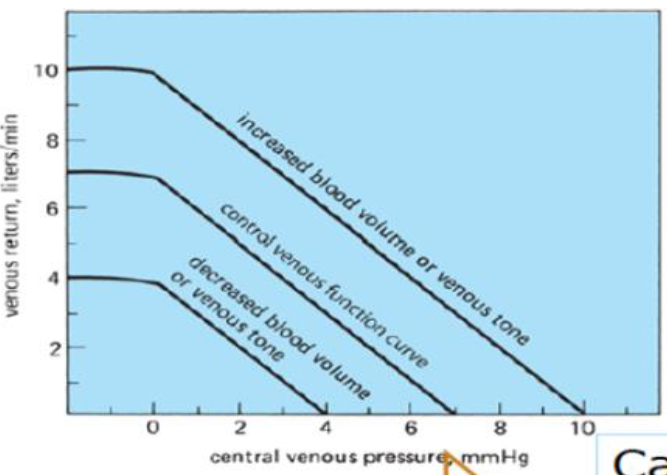 Ante ↑volemia y/o ↑tono, el retorno venoso va a aumentar, y por ende, la curva de retorno venoso se desplazará hacia arriba.