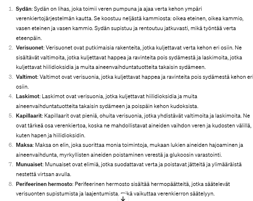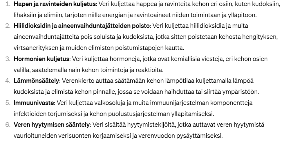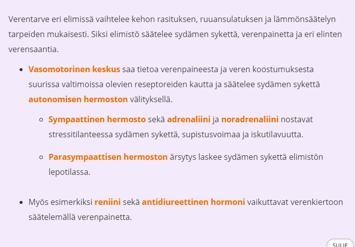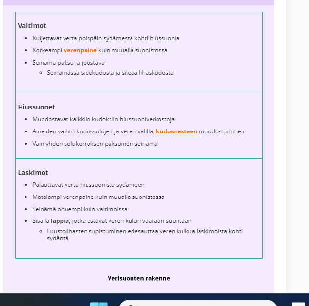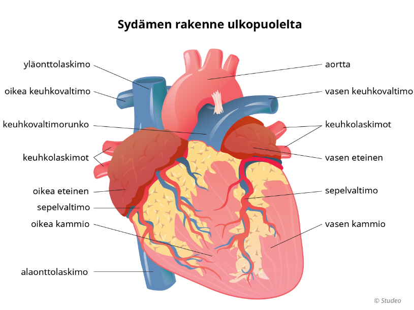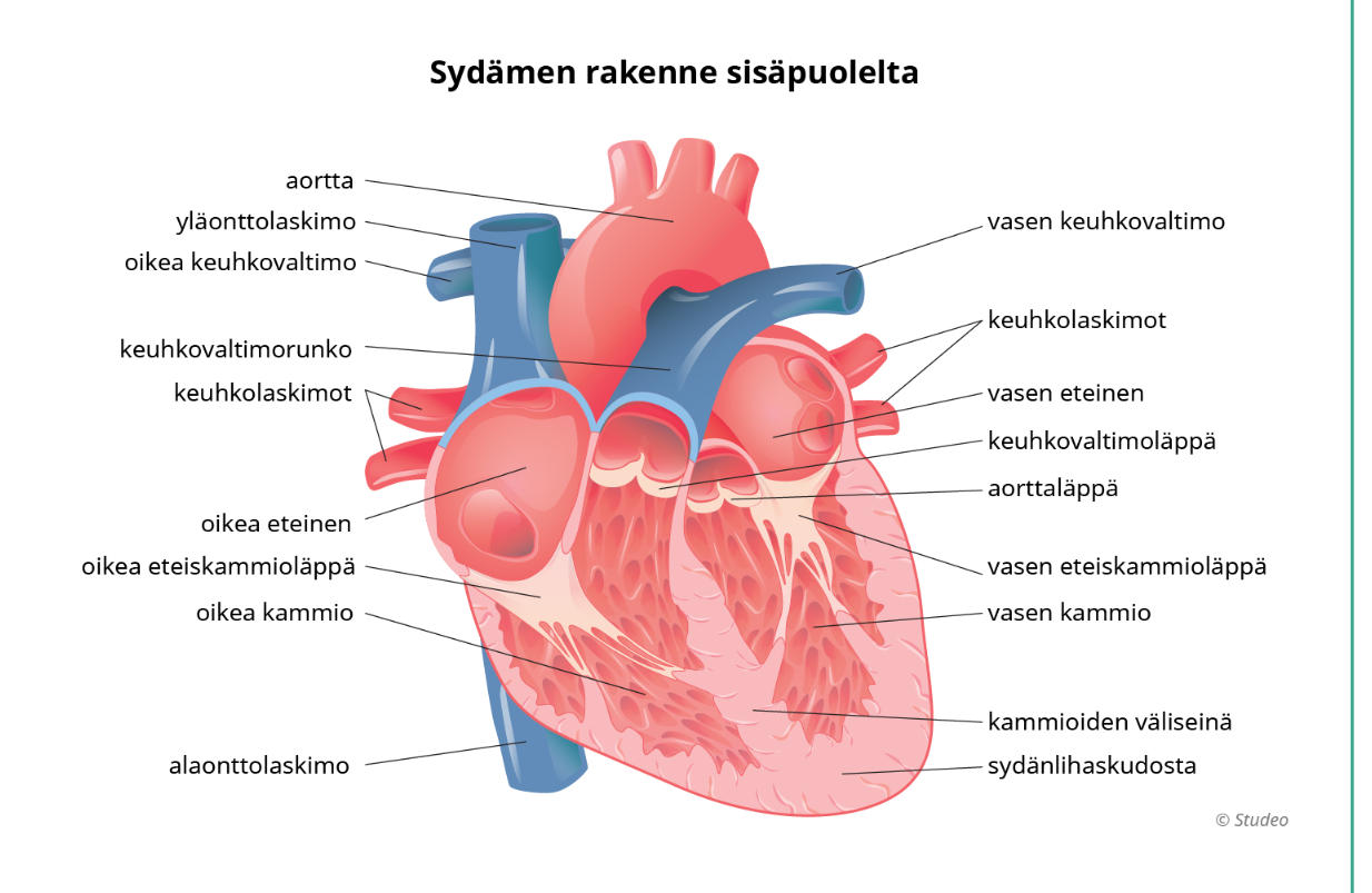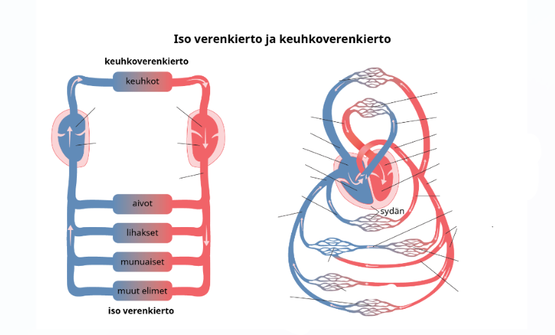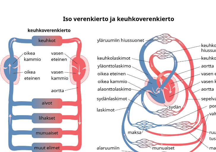 Veri syöksyy oikeasta kammiosta keuhkovaltimorunkoon ja vasemmasta kammiosta aorttaan.