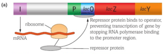 4) Prevents transcription and thus translation- lacZ and lacY can’t be expressed-genes are off- β-Galactosidase and lactose permease not made