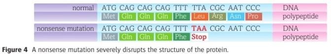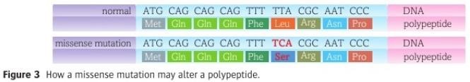 An example of a disease resulting from a missense mutation is sickle cell anaemia. There is a mutation on the sixth base triplet of the gene for the β-polypeptide chains of haemoglobin: glutamic acid is substituted for valine. This results in deoxygenated haemoglobin crystallising within erythrocytes, causing them to become sickle shaped, blocking capillaries and depriving tissues of oxygen.