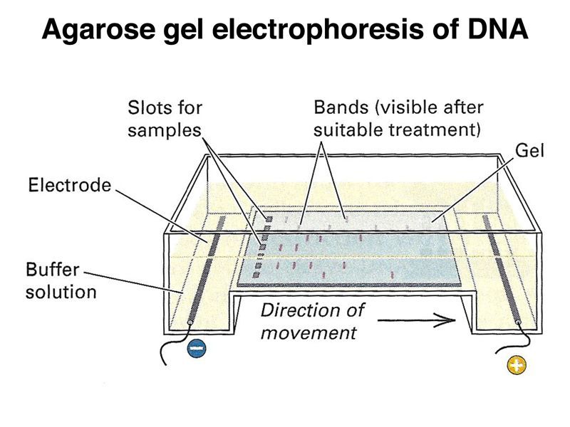 Place DNA fragments into wells in agarose gel strips (load DNA) at the cathode (that have buffers to maintain pH)