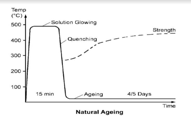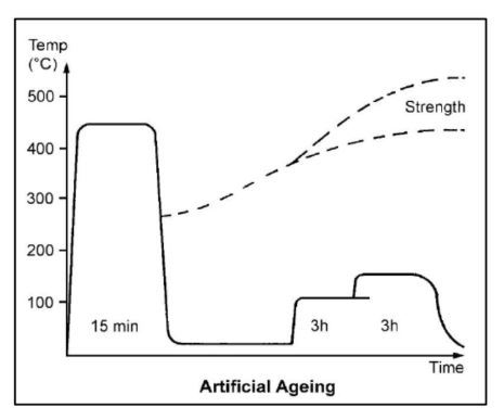 The process of solution heat treated or natural aging may be sped up or increased by returning the metal to the oven and heating to a temp lower than that used prev.