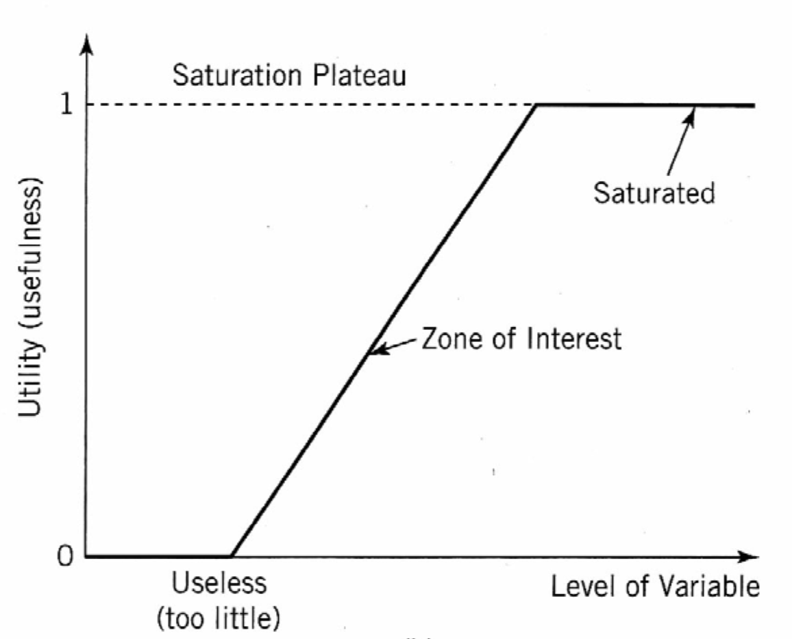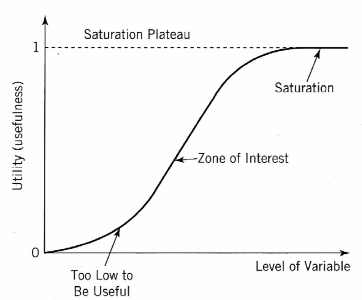 Utility saturation curves show that no additional benefit is achieved below some minimal realized level and above saturation.