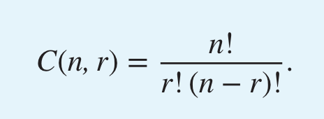 The number of r combinations of a set with n distinct elements, denoted C(n, r) or alternately,