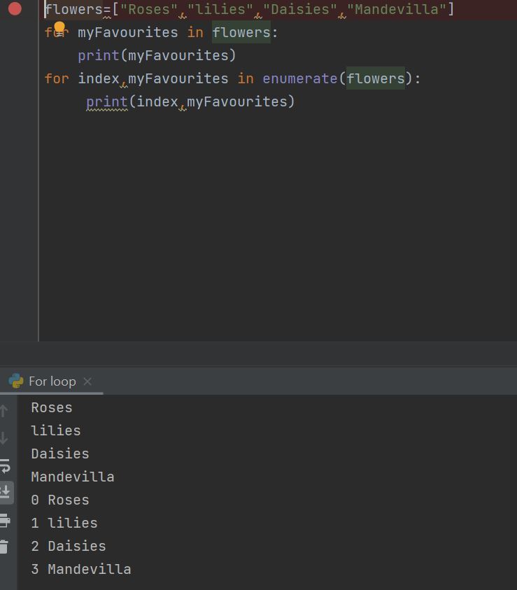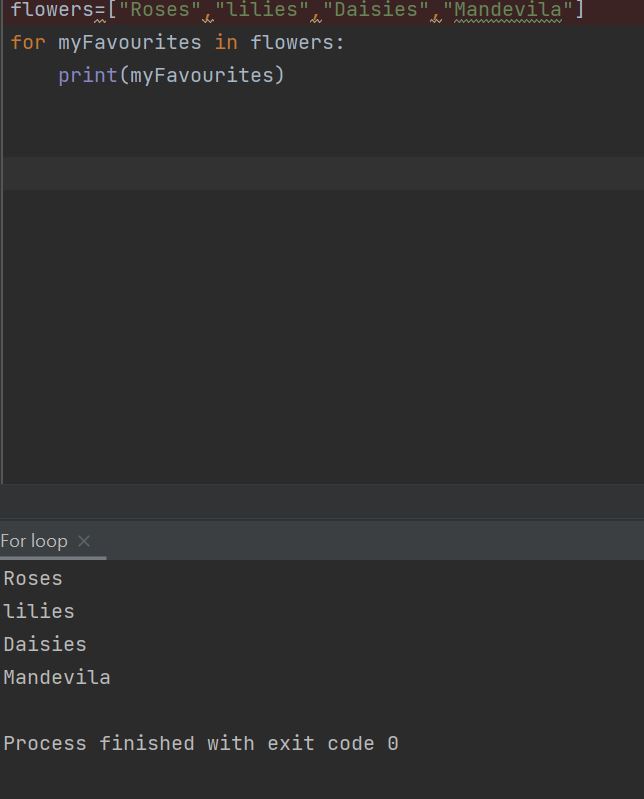 flowers=[“Roses”,”lilies”,”daisies”,”Mandevila”]