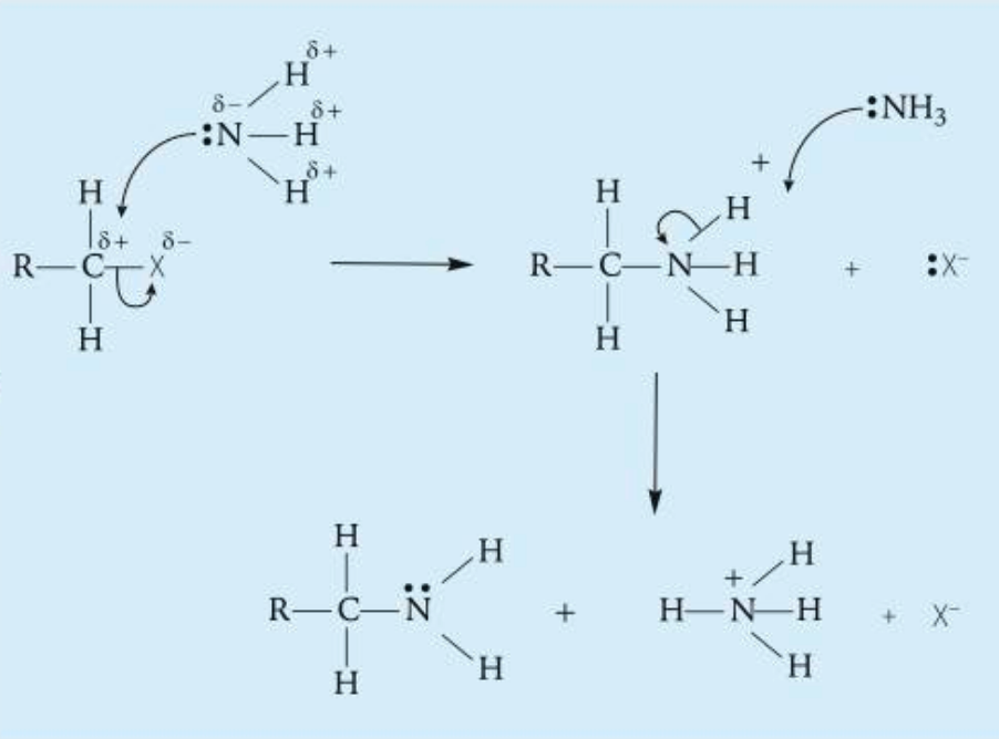 halogen replaced by NH2, done in ethanol to prevent sub of water to produce an alcohol