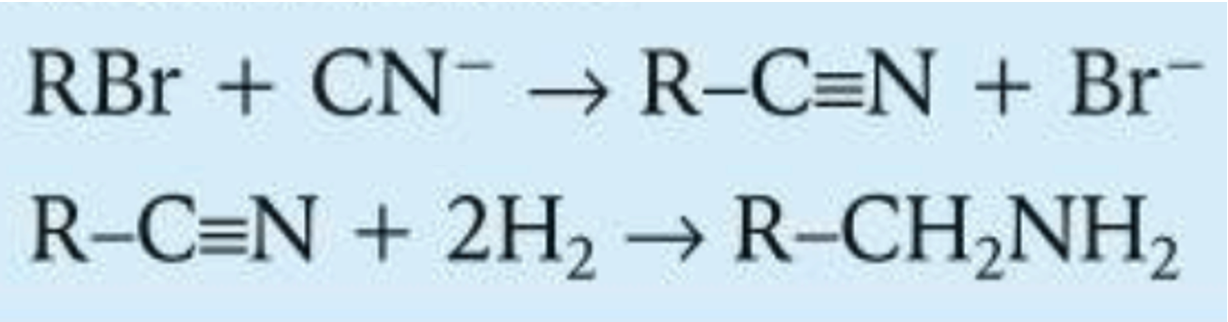 haloalkanes react with CN- in ethanol to form a nitrile which is reduced to a primary amine