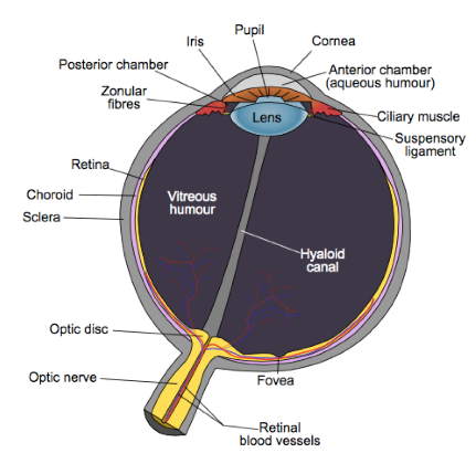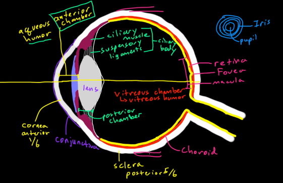 Iris - Gives the eye color; muscle that constricts/relaxes to change size of pupil → modulates amount of light entering eye (“accommodation”).