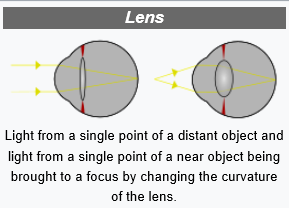 Lens - transparent, biconvex; refracts light → focuses onto retina.