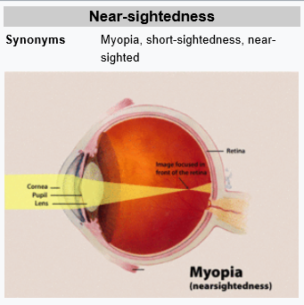 Myopia = nearsightedness, i.e. ability to see things up close, but not fr far away.