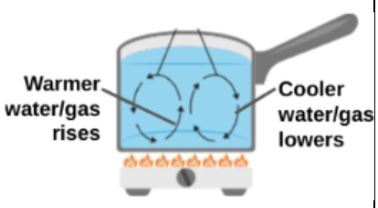 2.) A circular motion occurs because hot liquid & gas rise which pushes the cooler liquid & gas downward.