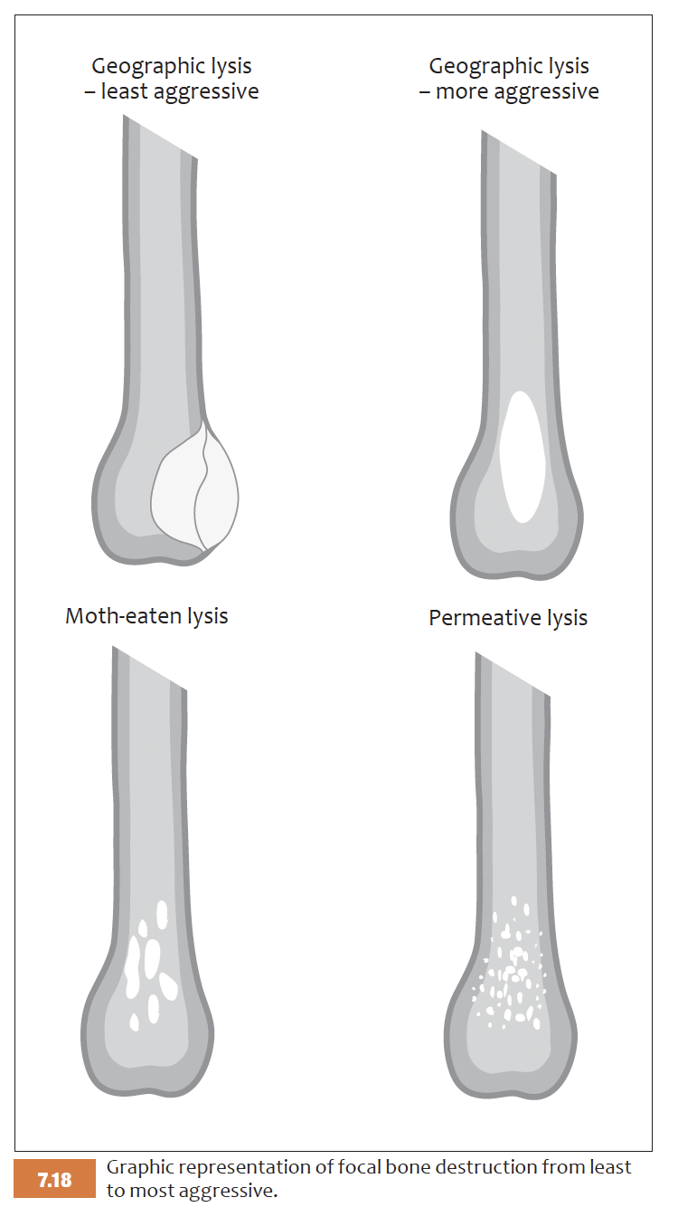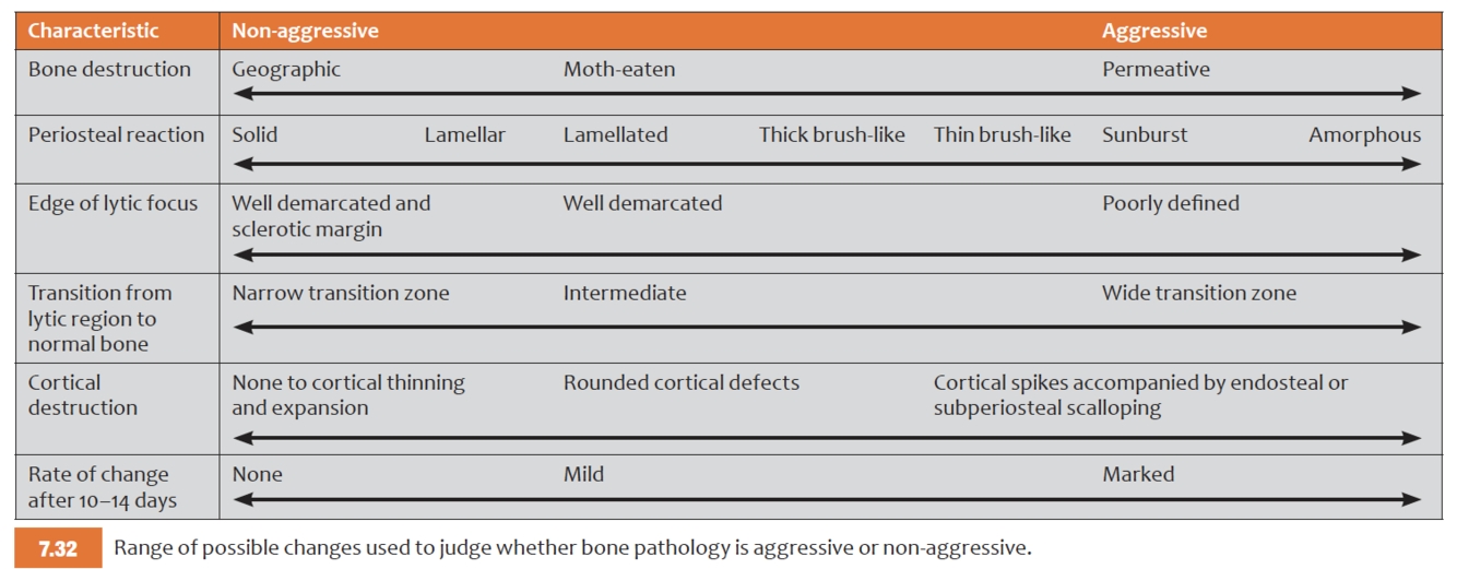 +- sclerotic rim. If present less aggressive, if not = “punched out”